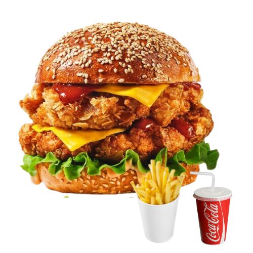 Salsa maionese, insalata, pomodoro, doppio filetto di pollo impanato e fritto, doppio formaggio